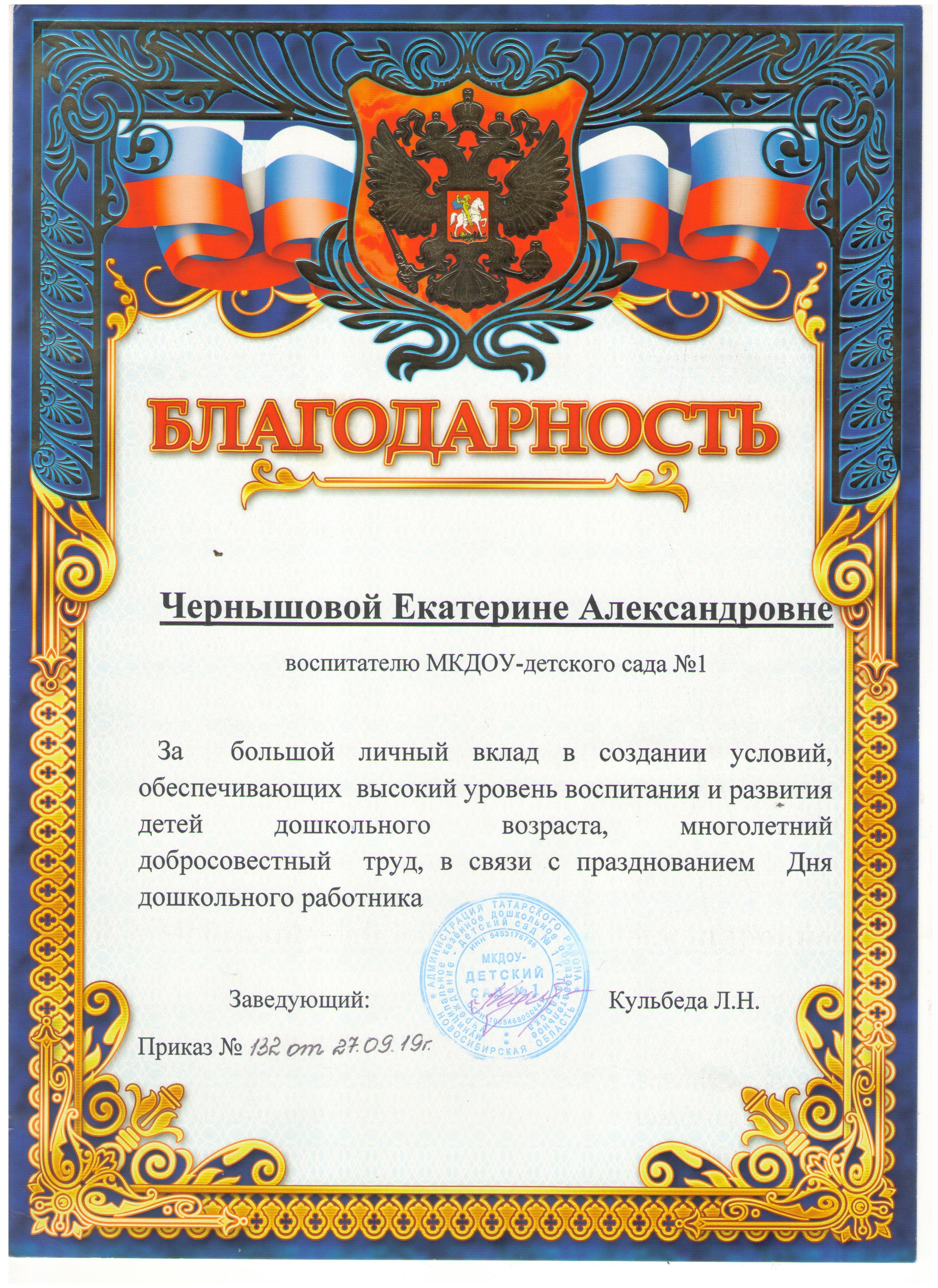 Благодарность Чернышовой Екатерине Александровне воспитателю МКДОУ - детского сада № 1 За большой личный вклад в создании условий, обеспечивающих высокий уровень воспитания и развития детей дошкольного возраста, многолетний добросовестный труд, в связи с празднованием Дня дошкольного работника