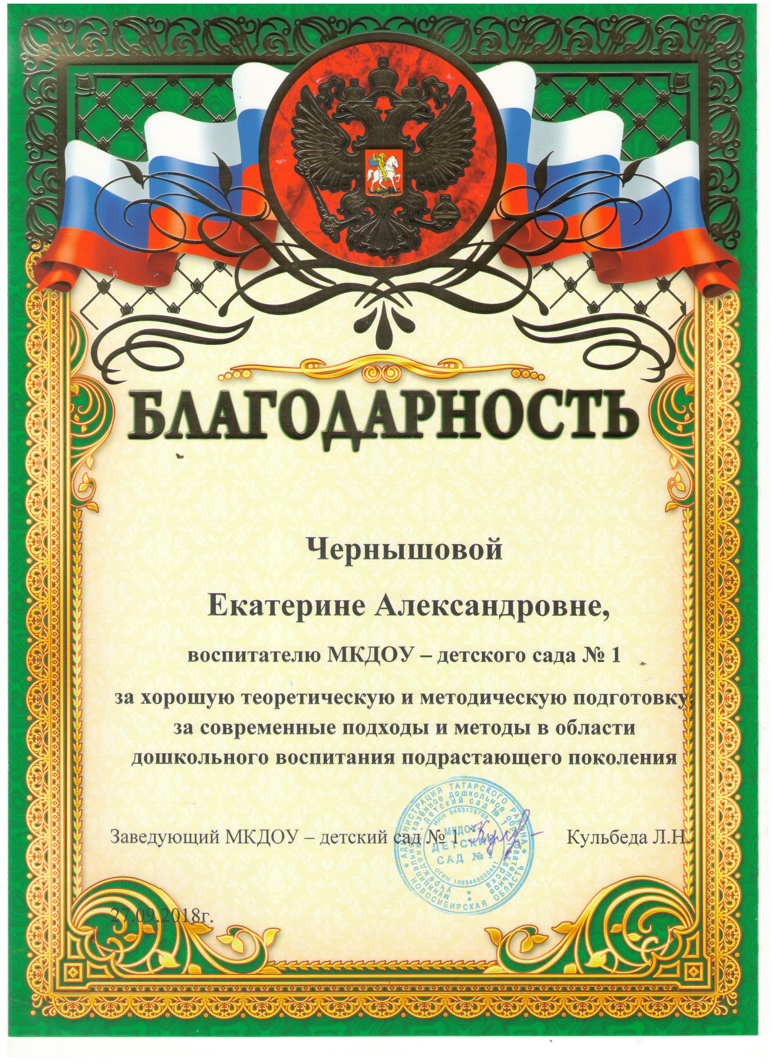 Благодарность Чернышовой Екатерине Александровне, воспитателю МКДОУ - детского сада № 1 за хорошую теоретическую и методическую подготовку за современные подходы и методы в области дошкольного воспитания подрастающего поколения