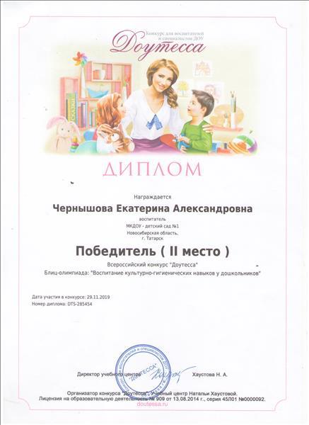 | Диплом награждается Чернышова Екатерина Алекандровна. Победитель (II место). Всероссийский конкурс "Доутесса". Блиц - олимпиада: " Воспитание культурно - гигиенических навыков у дошкольников" |