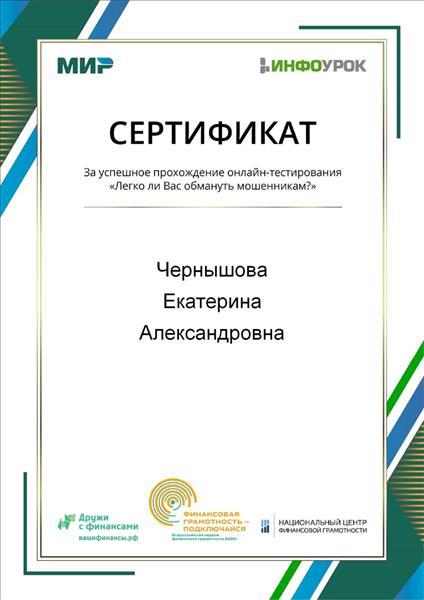 | Сертификат за успешное прохождение онлайн - тестирования "Легко ли Вас обмануть мошенникам?" Чернышова Екатерина Алекандровна |