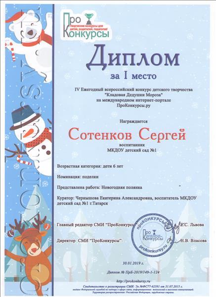 Награждается Сотенклв Сергей воспитанник МКДОУ детский сад №1