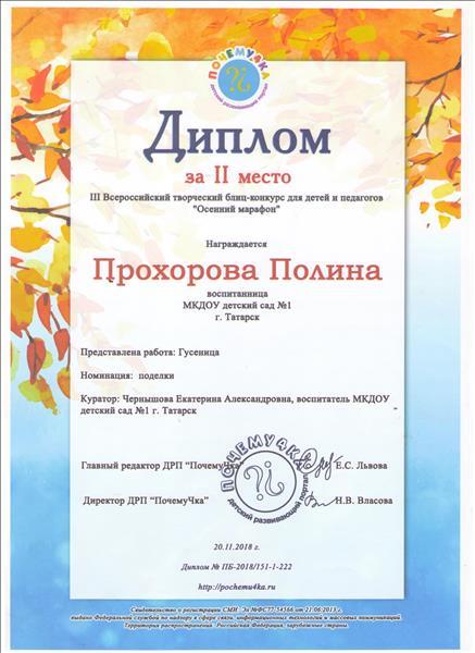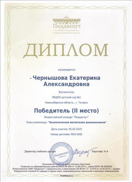 | Дипломом награждается Чернышова Екатерина Александровна. Победитель (II место). Всероссийский конкурс "Педдиспут". Блиц - олимпиада "Экологическое воспитание дошкольников" |