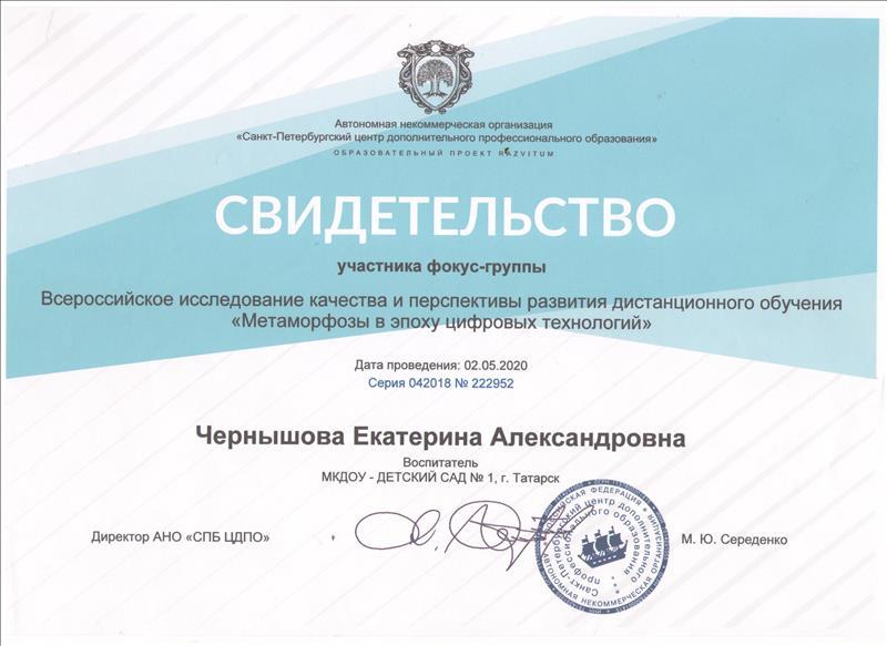 | Свидетельство участник фокус - группы. Всероссийское исследование качества и перспективы развития дистанционного обучения "Метаморфозы в эпоху цифровых технологий" |