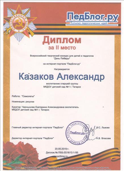 | Диплом за II место Всероссийский творческий конкурс для детей и педагогов "День Победы" Награждается Казаков Александр воспитанник старшей группы МКДОУ детский сад №1
