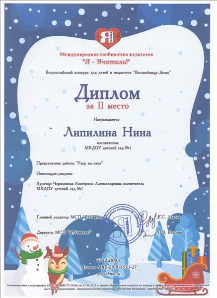 | Всероссийский конкурс для детей и педагогов "Волшебница - Зима" Диплом за II место
