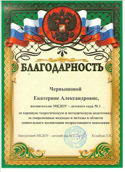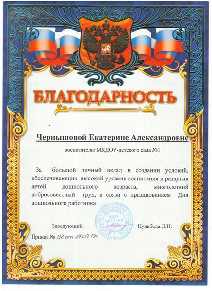 | Благодарность Чернышовой Екатерине Алекаандровне за большой личный вклад в создании условий, обеспечивающих высокий уровень воспитания и развития детей дошкольного возраста, многолетний добросовестный труд, в связи с праздником Дня дошкольного работника |