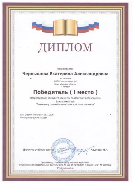 | Диплом награждается Чернышова Екатерина Александровна. Победитель (I место). Всероссийский конкурс "Горизонты педагогики". Блиц - олимпиада: "Значение утренней гимнастики для дошкольников" |