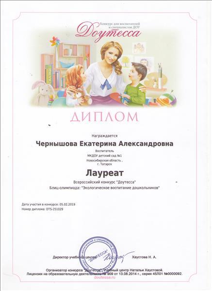| Дипломом награждается Чернышова Екатерина Александровна. Лауреат. Всероссийский конкурс "Доутесса". Блиц - олимпиада: " Экологическое воспитание дошкольников" |