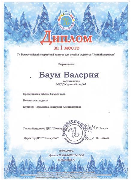 | Диплом за I место Всероссийский детский творческий конкурс "Зимняя фантазия"