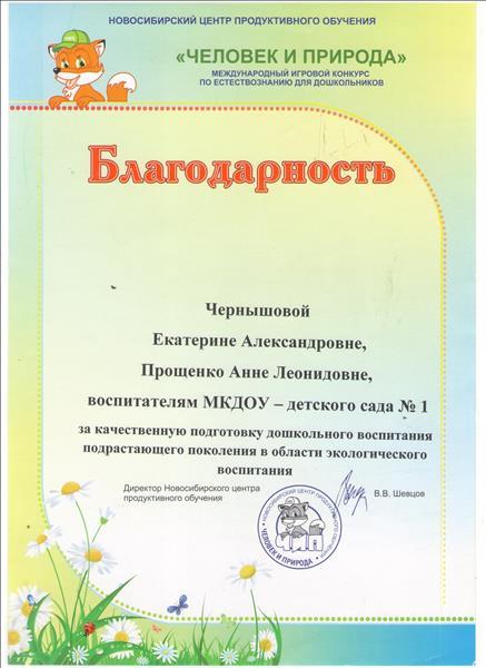 | Благодарность Чернышовой Екатерине Александровне, Прощенко Анне Леонидовне, воспитателям МКДОУ - детский сад № 1 за качественную подготовку дошкольного воспитания подрастающего поколения в области экологического воспитания |