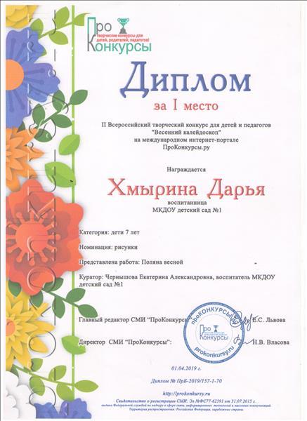 | Диплом за I место II Всероссийский конкурс детей и педагогов "Весенний калейдоскоп"
