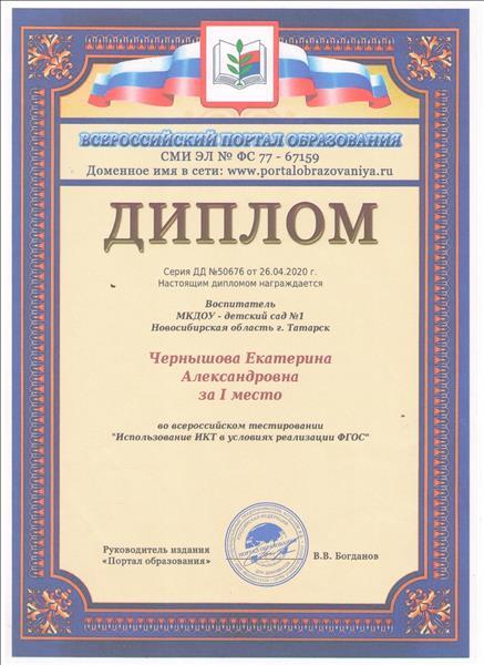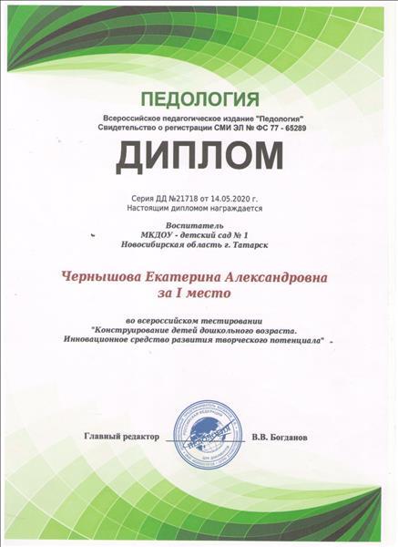 | Диплом. Настоящим дипломом награждается Чернышова Екатерина Александровна за I место во всероссийском тестировании "Конструирование детей дошкольного возраста. Инновационное средство развития творческого потенциала" |