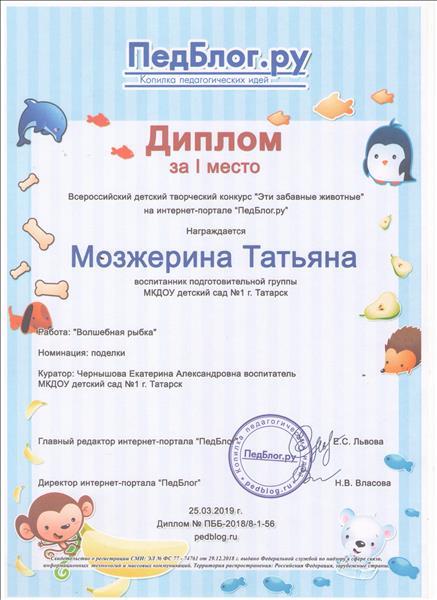 | Диплом за I место Всероссийский детский творческий конкурс "Эти забавные животные" Награждается Мозжерина Татьяна воспитанник подготовительной группы МКДОУ - детский сад №1