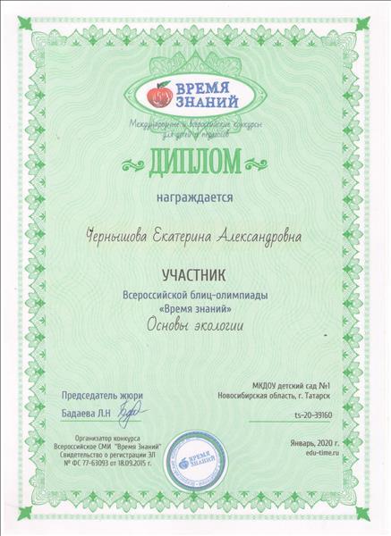 | Диплом награждается Чернышова Екатерина Александровна. Участник Всероссийской блиц - олимпиады "Время знаний" Основы экологии |