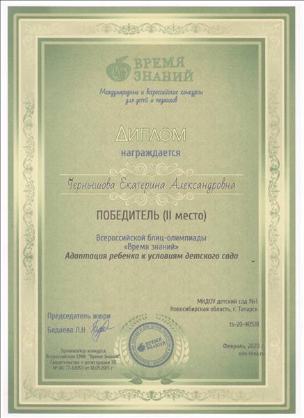 | Диплом награждается Чернышова Екатерина Александровна. Победитель (II место). сероссийской блиц - олимпиаде "Время знаний" Адаптация ребенка к условиям детского сада |