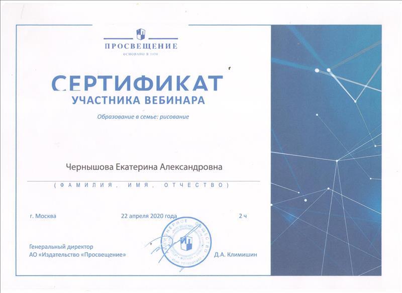 | Сертификат участника вебинара. Образование в семье: рисование . Чернышова Екатерина Александровна. |