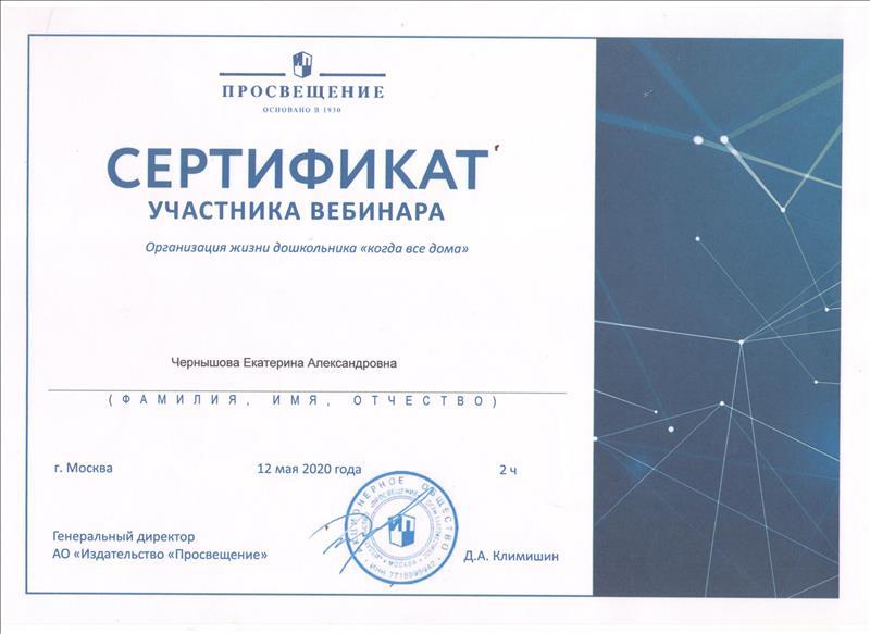 | Сертификат участника вебинара. Организация жизни дошкольника "когда все дома". Чернышова Екатерина Александровна |