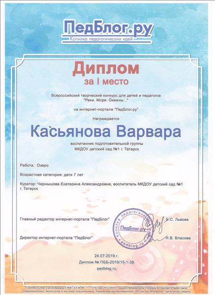 Награждается Касьянова Варвара воспитанник подготовительной группы