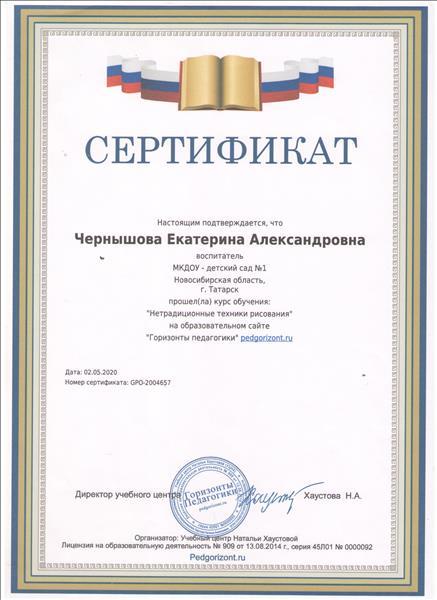 | Сертификат. Настоящим подтверждает, что Чернышова Екатерина Алекандровна прошла курс обучения: "Нетрадиционные техники рисования" на образовательном сайте "Горизонты педагогики" |