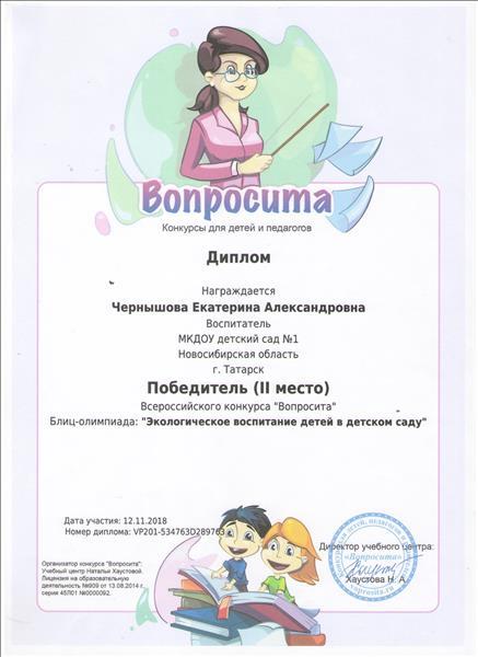 | Диплом. Награждается Чернышова Екатерина Алесандровна. Победитель (II место). Всероссийского конкурса "Вопросита". Блиц - олимпиада "Экологическое воспитание детей в детском саду" |