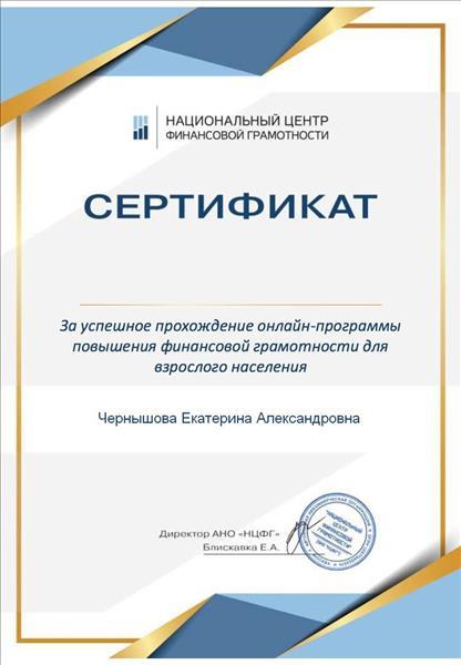 | Сертификат за успешное прохождение онлайн - программы повышения финансовой грамотности для взрослого населения. Чернышова Екатерина Александровна |