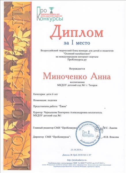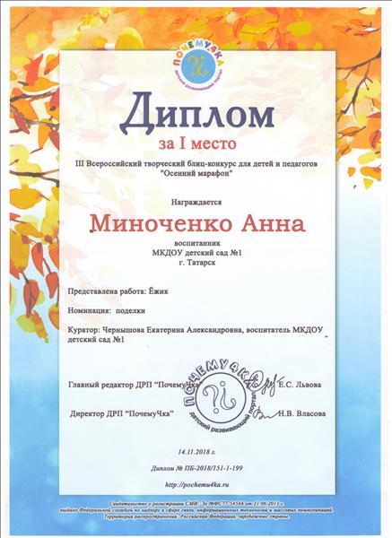 Награждается Миноченко Анна воспитанник МКДОУ детский сад №1 г. Татарск